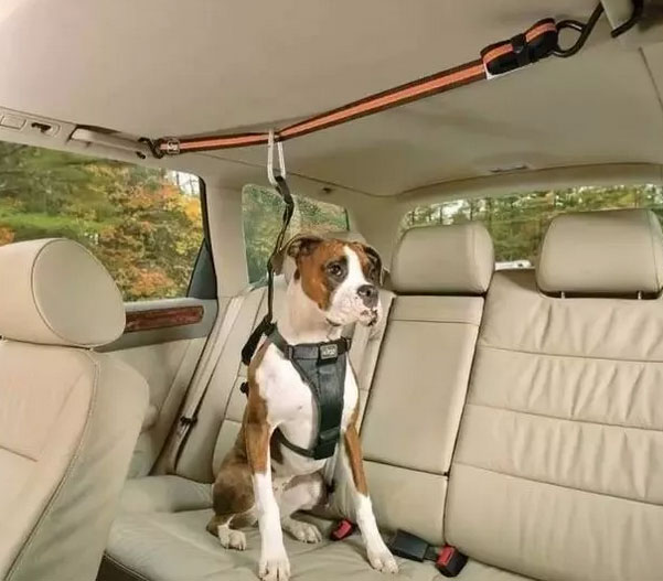 9. 車(chē)載妙招  狗狗總愛(ài)從后座竄到前面咋辦?  看圖!將繩子固定在車(chē)后座的安全扶手上,再用卡扣固定住狗狗,既不影響狗狗在后座活動(dòng),又能防止它竄到前面去。
